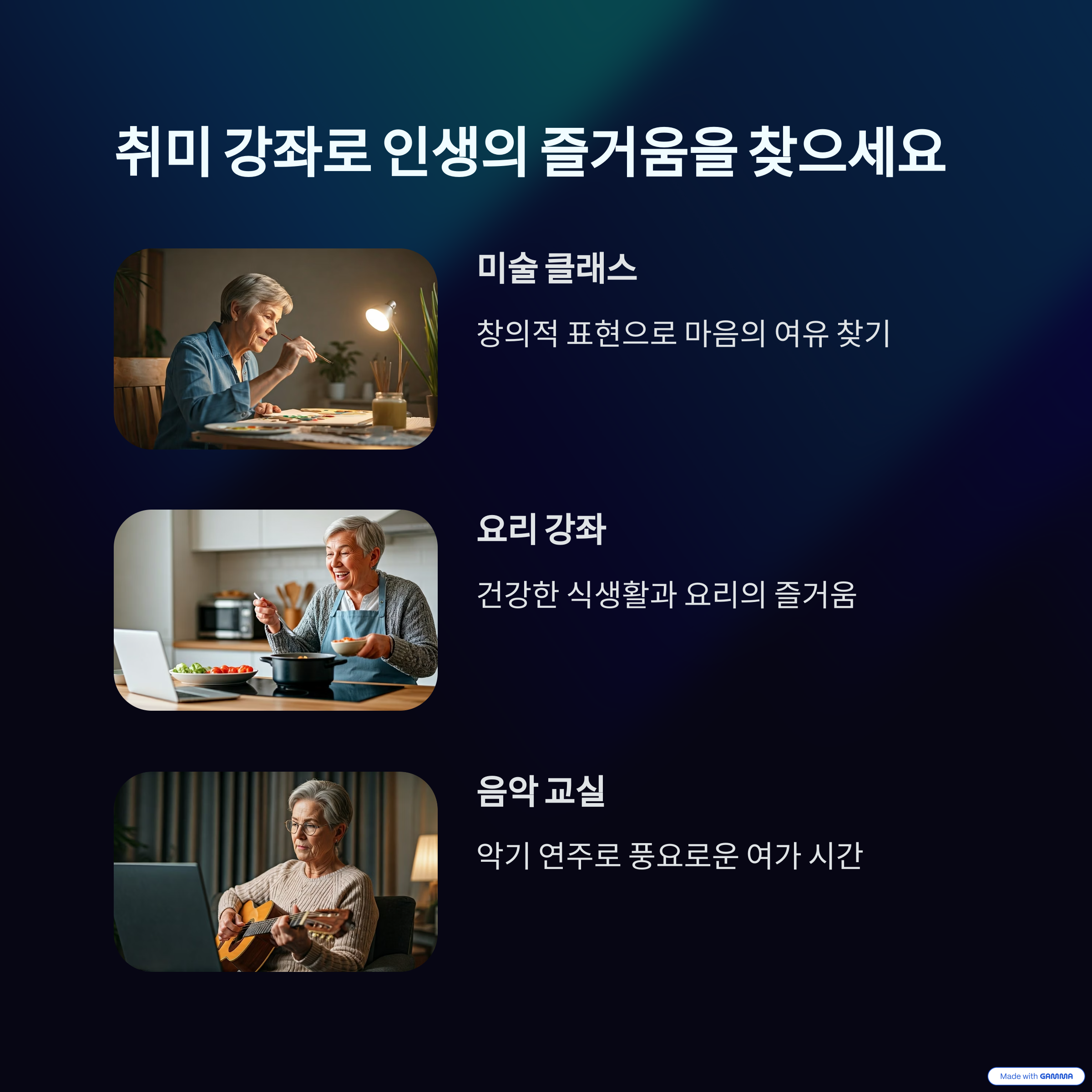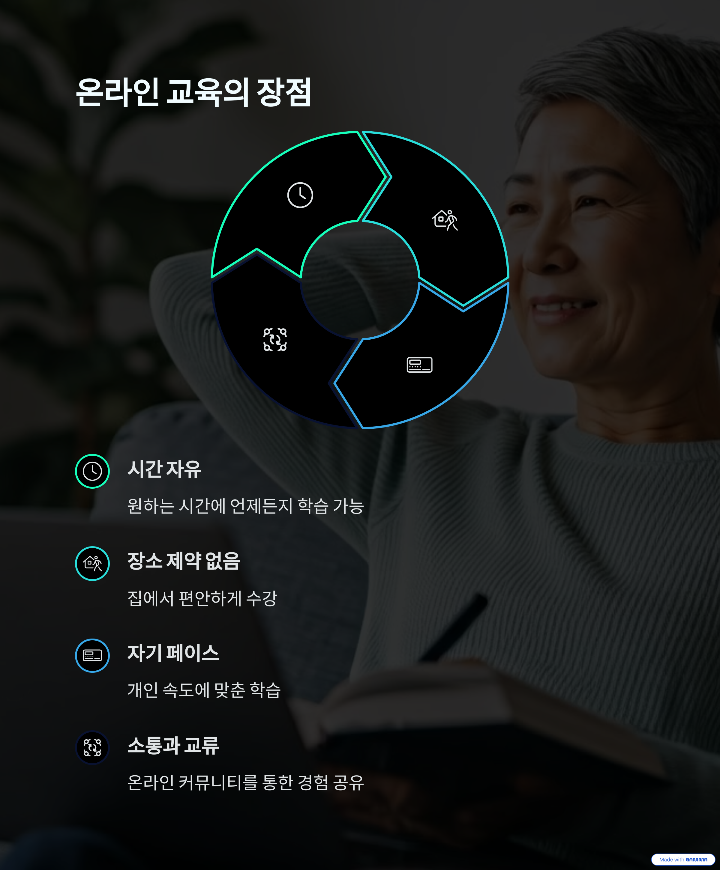 중요한 건 "나도 할 수 있다"는 용기입니다. 온라인 교육을 통해 새로운 취미를 시작하거나, 경력 전환의 길을 열어가며 인생의 두 번째 챕터를 더 풍성하게 채워보세요.