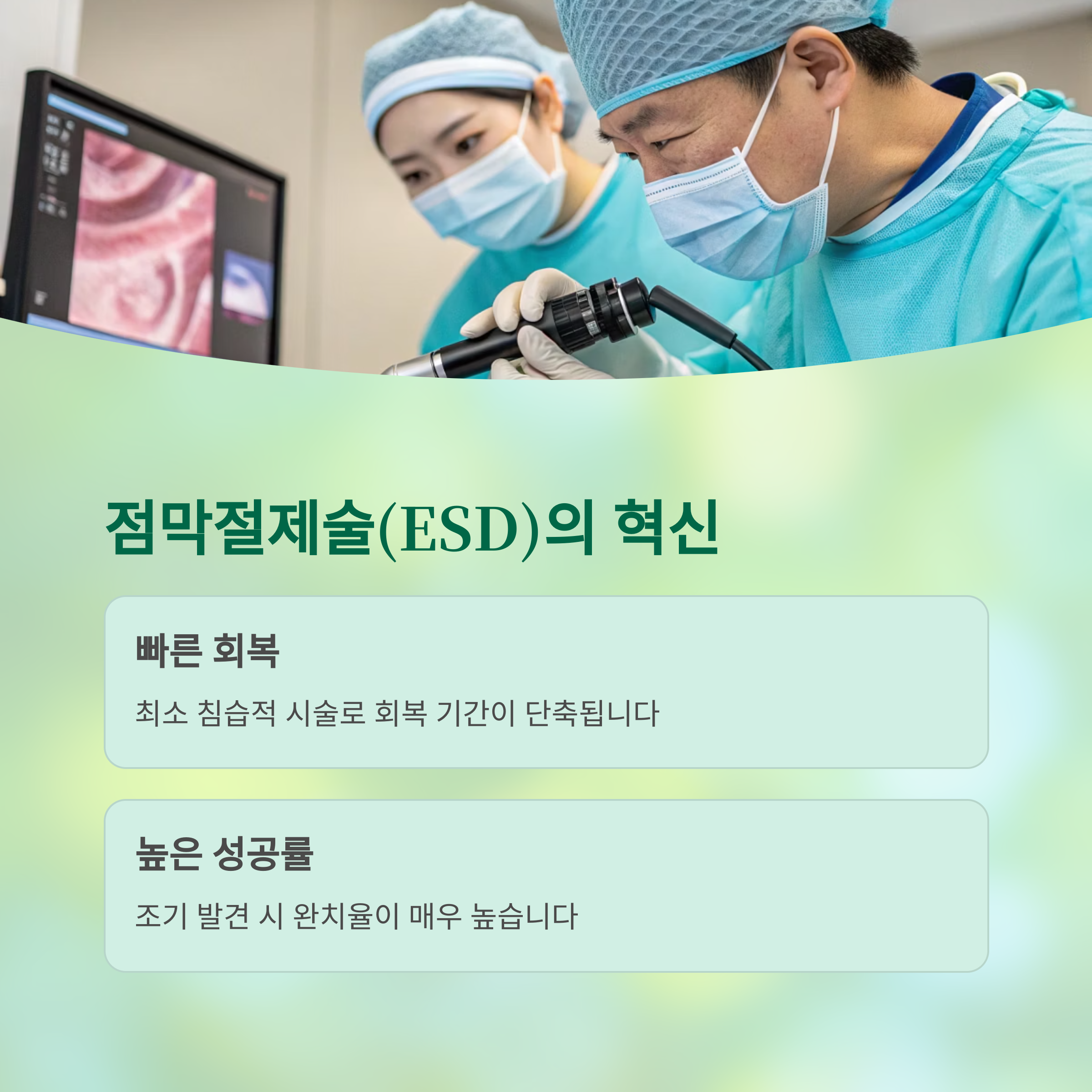 위내시경 검사를 통해 초기 위암이나 암 전 단계 병변이 발견되면, 최근에는 수술보다 점막절제술(Endoscopic Submucosal Dissection, ESD)을 선택하는 사례가 늘고 있습니다. 점막절제술은 복부 절개 없이 내시경을 이용해 병변만 정밀하게 제거하는 시술로, 5060세대에게 특히 유리한 치료법입니다.