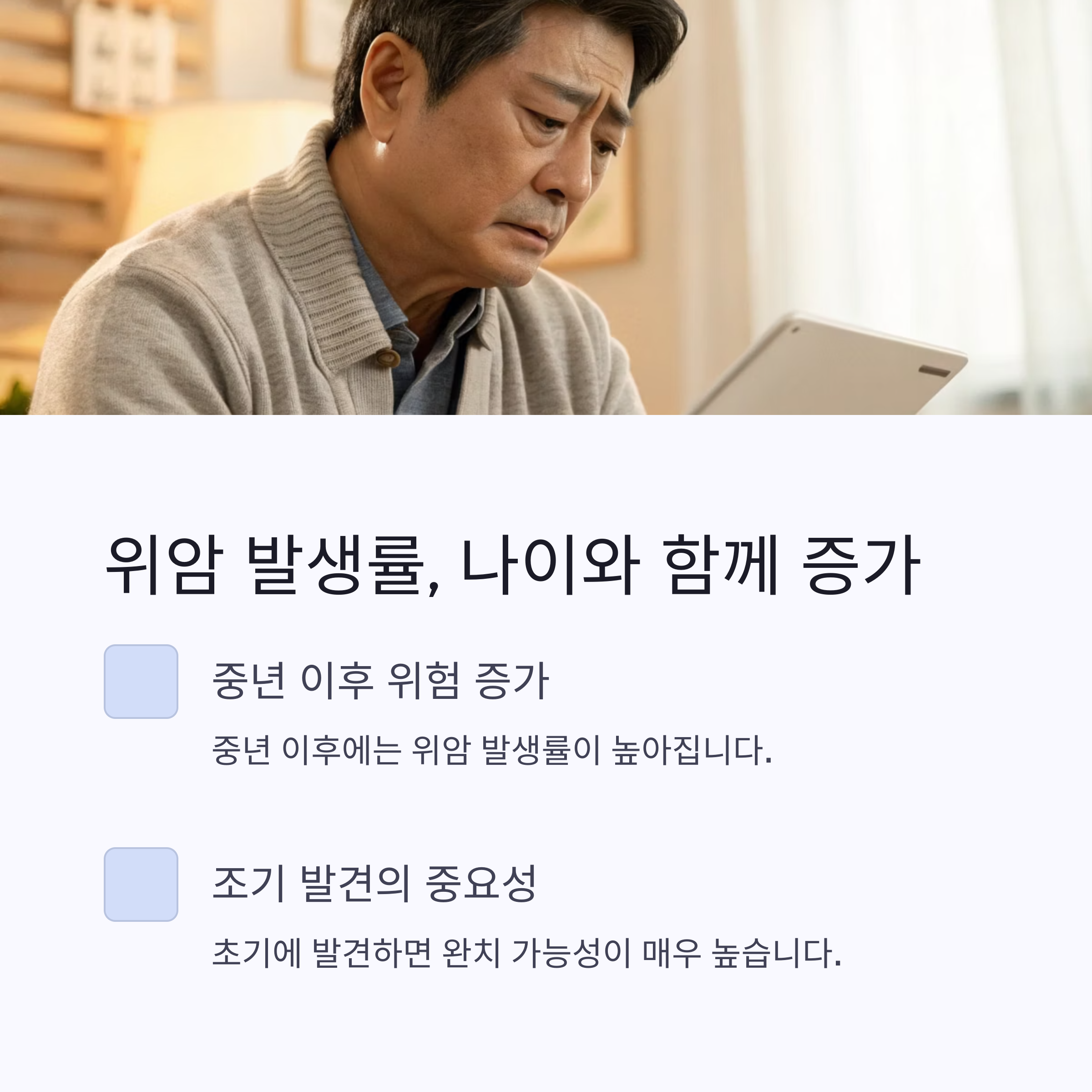 | 중년 위암 발생률 | 50대 이후 위암 진단 비율은 빠르게 증가합니다. |