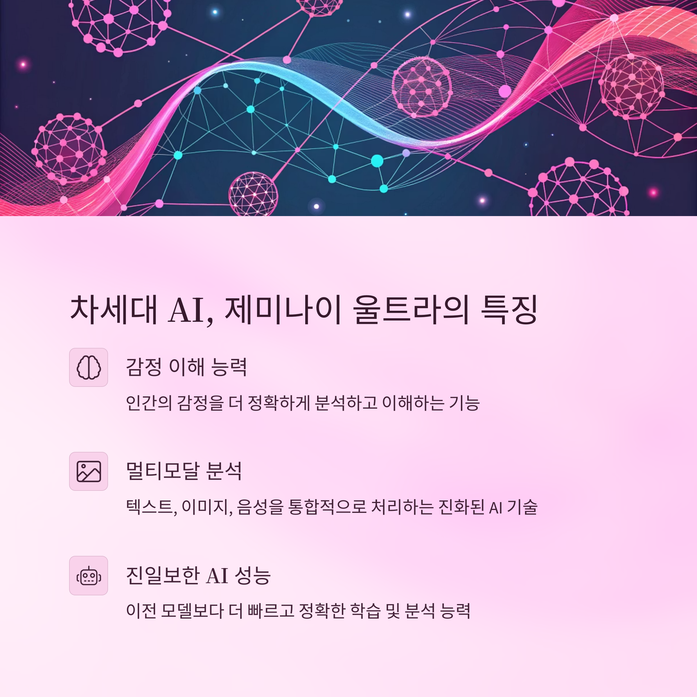 제미나이 울트라는 멀티모달 처리 능력을 강화하여 이미지, 음성, 언어를 통합 분석할 수 있으며, 감정 인식과 창의적 표현도 가능해진 차세대 AI입니다.