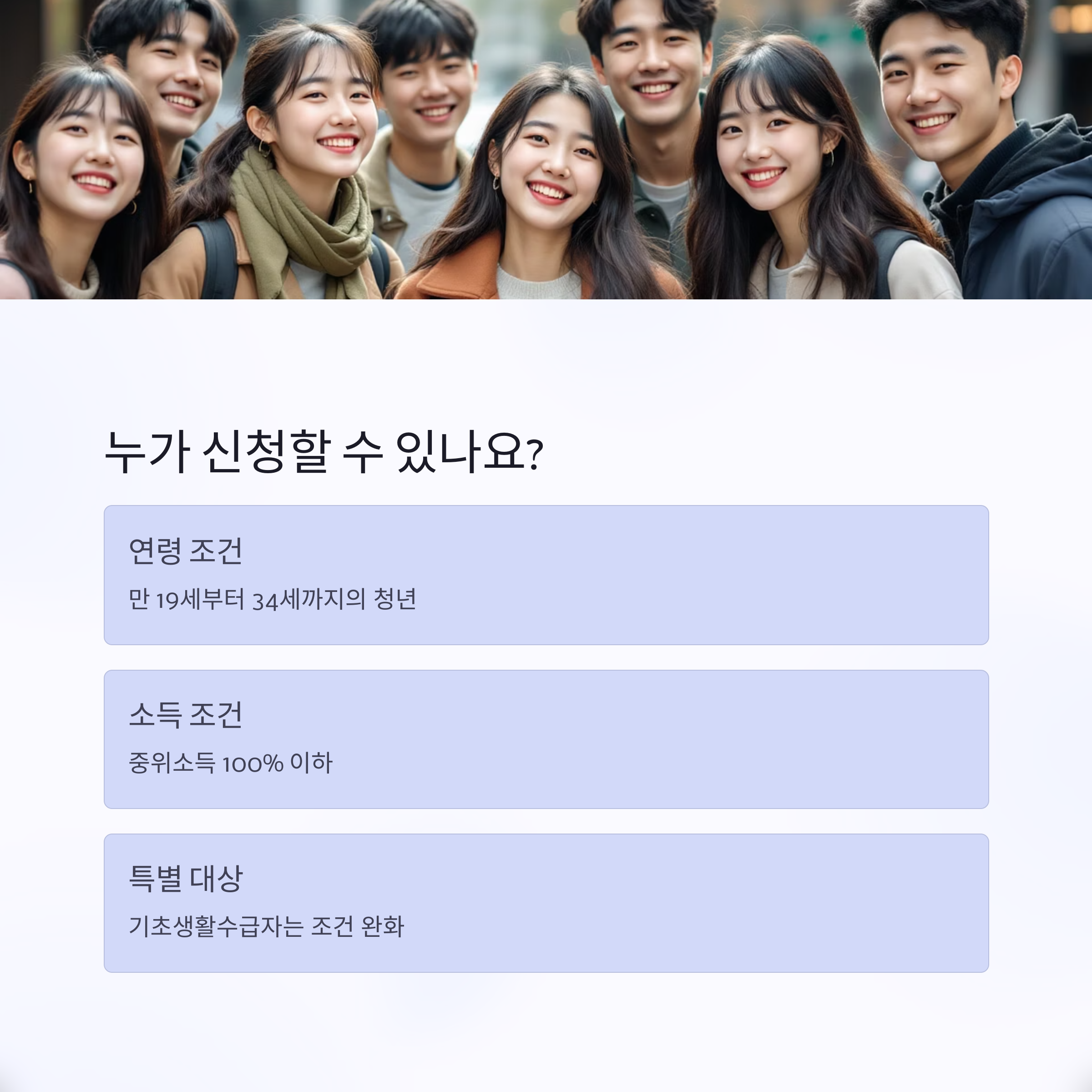 신청 조건은 만 19세 이상부터 34세 이하의 청년으로, 근로 또는 사업소득이 있으며, 중위소득 100% 이하인 자입니다. 기초생활수급자나 차상위 계층은 소득 기준이 더 완화됩니다.