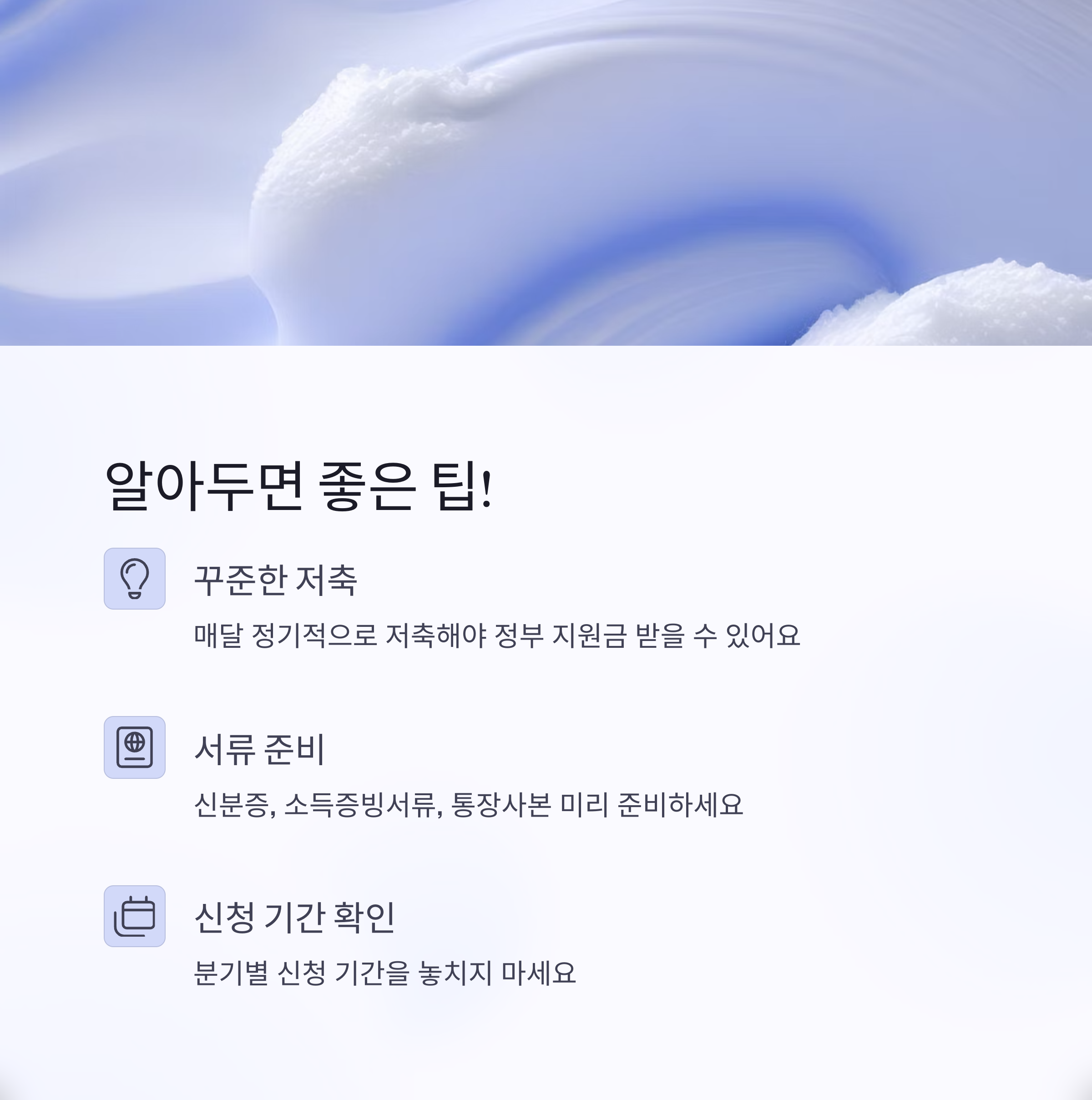 | 만 19~34세, 근로·사업소득, 중위소득 기준 | 월 10만원 저축 시 최대 30만원 지원 | 복지로 또는 주민센터에서 신청 가능 |