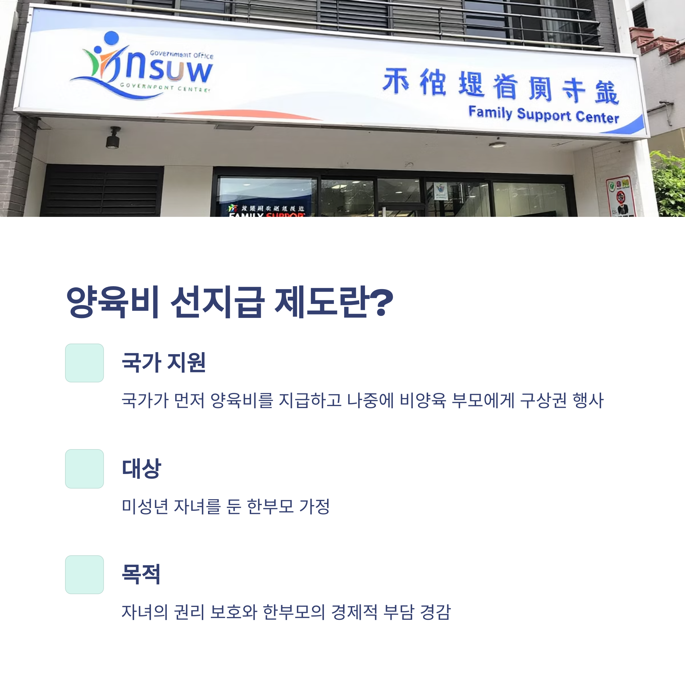 | 자녀의 생활권 보호와 학습권 보장을 위해 중요 | 이후 국가가 채무자에게 구상권 행사 | 신청 전 상담 및 준비서류 확인 필요 |