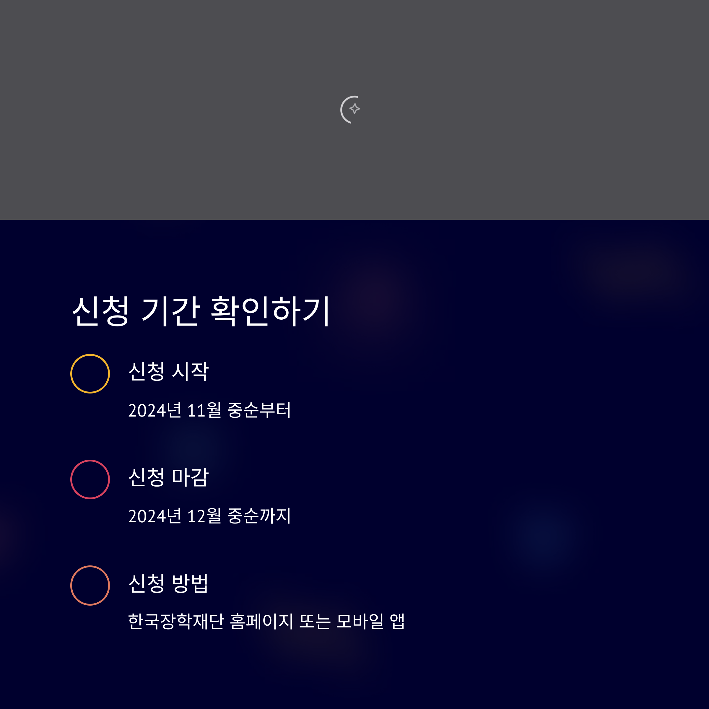 | 2024년 11월 중순 ~ 12월 중순 예상 | 한국장학재단 홈페이지 및 모바일 앱 이용 | 제출서류 및 소득정보 정확히 확인 필수 |