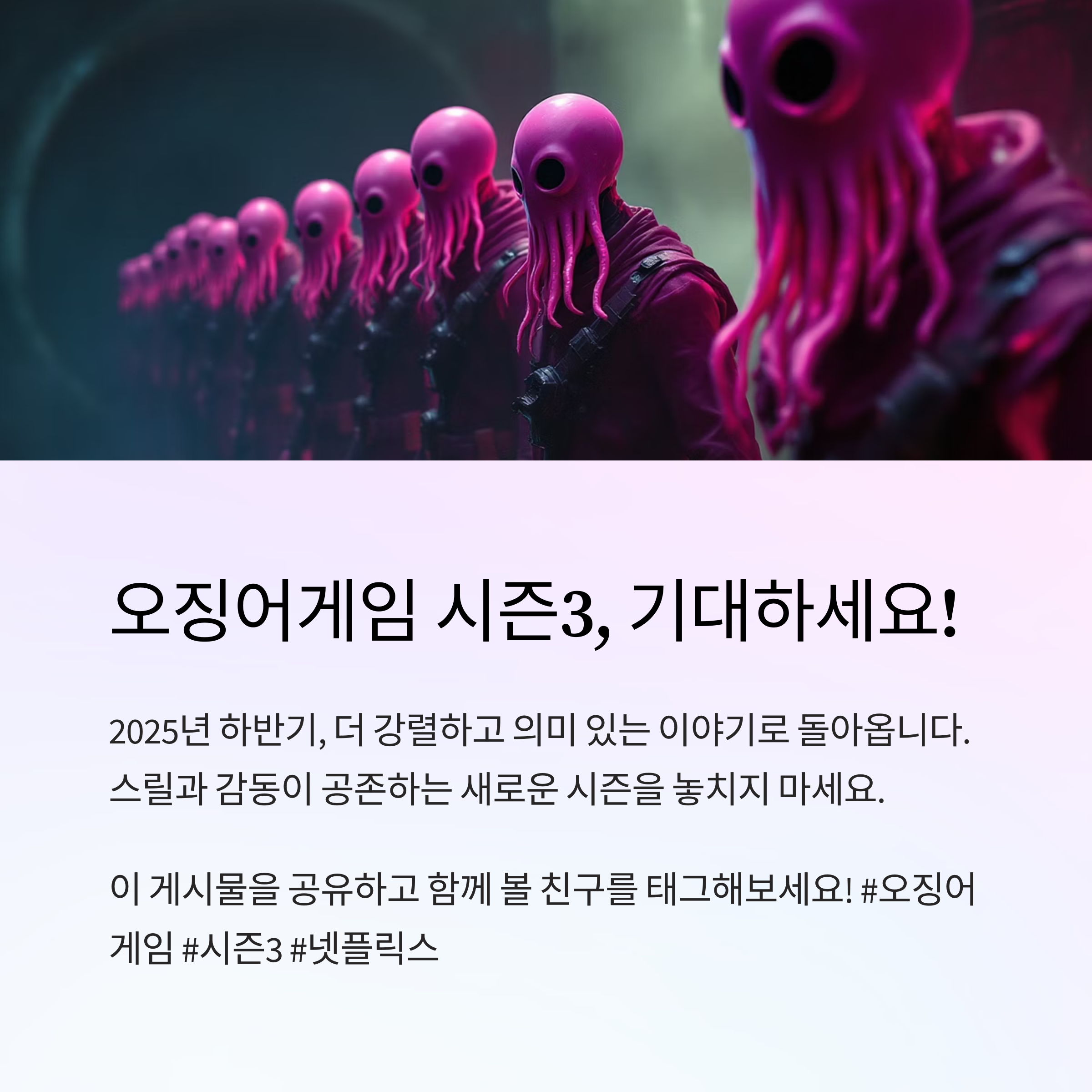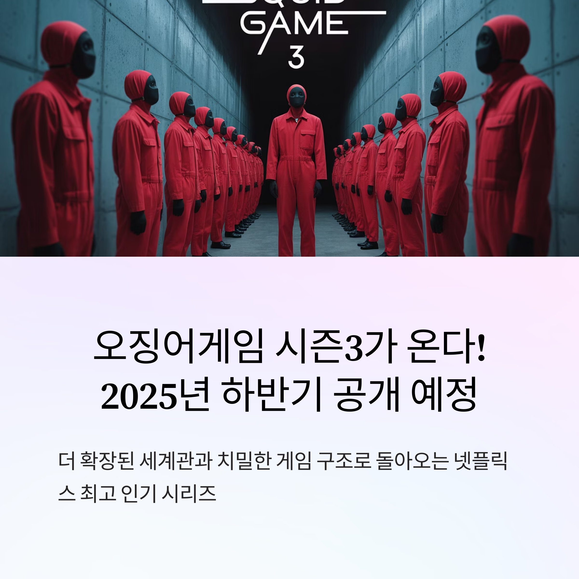 시청자 여러분의 기대에 부응할 수 있는 완성도 높은 콘텐츠로 찾아올 오징어게임 시즌3, 꼭 주목해 보시길 바랍니다.