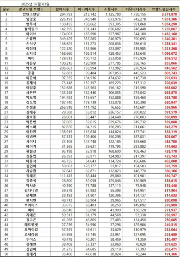 7월 브랜드 평판 톱 2에 오른 임영웅 님은 그의 광고 영향력과 대중 호감도가 여전함을 입증했습니다. 특히 미디어 노출과 커뮤니티 반응이 강세였던 점에서, 팬덤을 넘어 일반 소비자층까지 넓은 공감을 얻고 있다는 분석입니다. 단순히 팬덤에만 의존하는 것이 아니라, 대중적인 인기를 바탕으로 광고 효과를 극대화하고 있다는 것이죠.