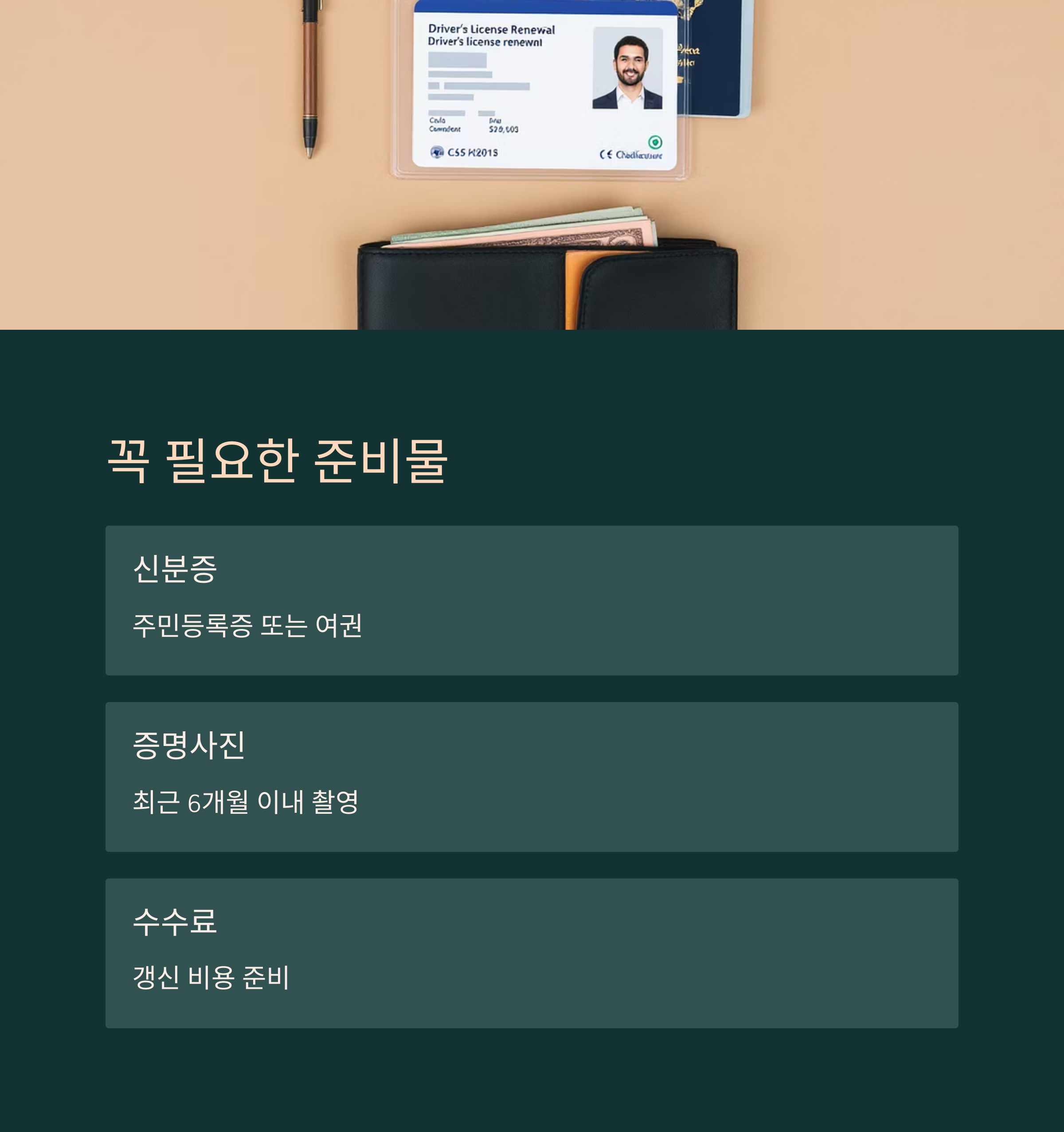 갱신 시 준비물도 빠뜨릴 수 없습니다. 신분증, 최근 6개월 이내 촬영한 증명사진 1매, 갱신 수수료를 준비해야 하며, 현장 방문 시 간단한 시력검사도 포함됩니다.