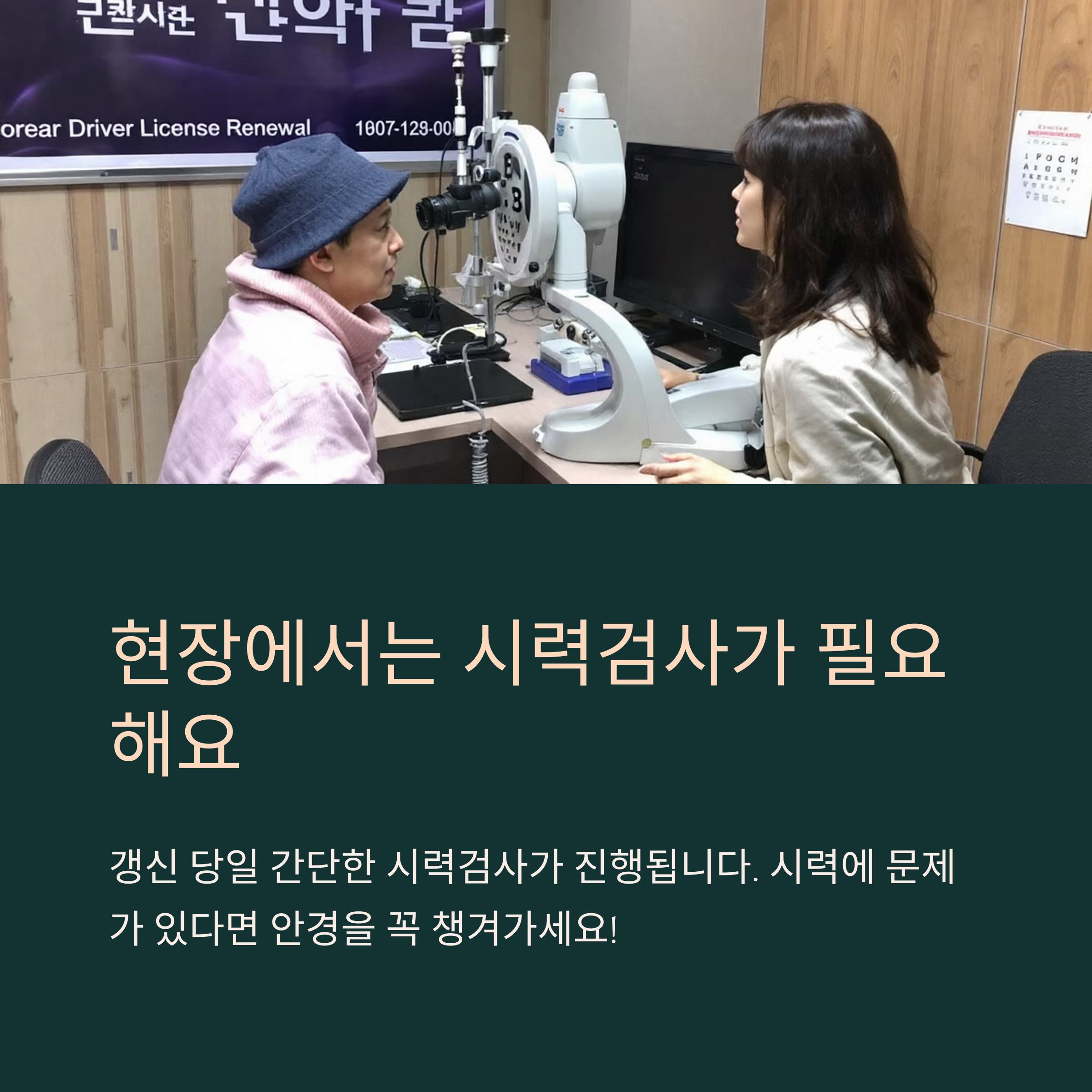 | 만료 6개월 전부터 갱신 가능 | 혼잡도 확인 후 시간대 선택 | 시력검사 포함 시 유의 |