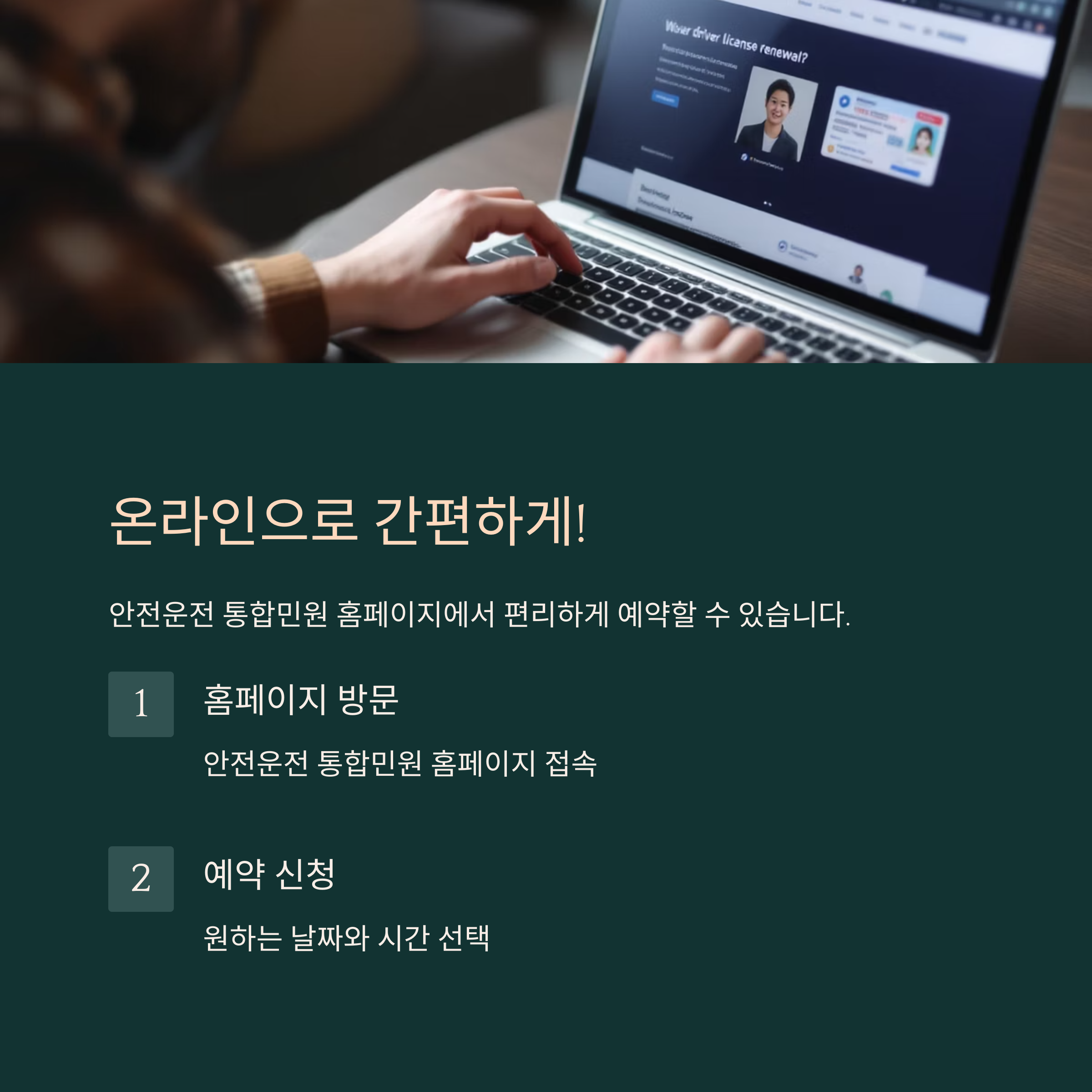 | 온라인 예약 | 안전운전 통합민원 홈페이지에서 가능해요 |