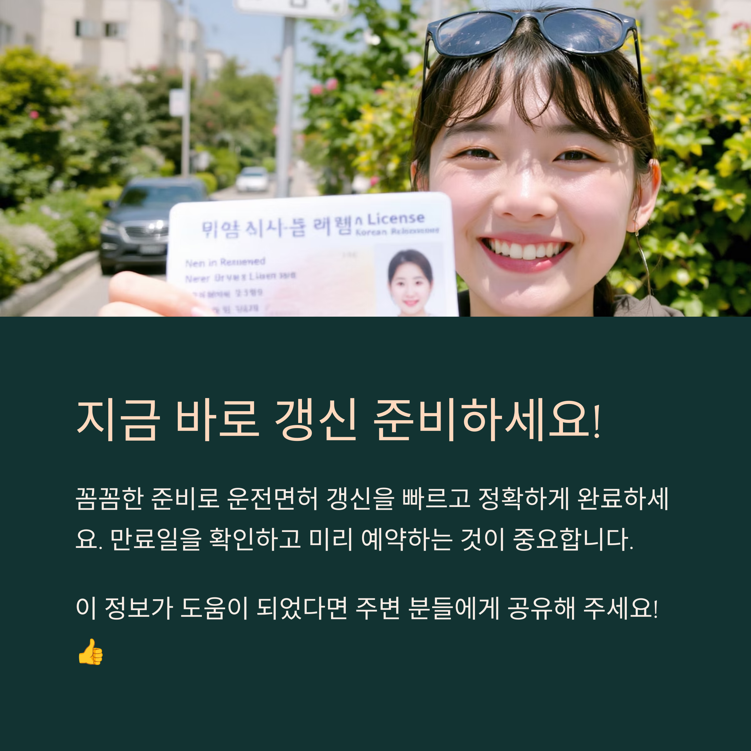 운전면허는 우리의 일상과 직결된 중요한 자격입니다. 조금만 신경 쓰면 누구나 쉽고 빠르게 갱신할 수 있습니다. 아래 내용을 참고해 불필요한 시간 낭비 없이 깔끔하게 마무리해 보세요!
