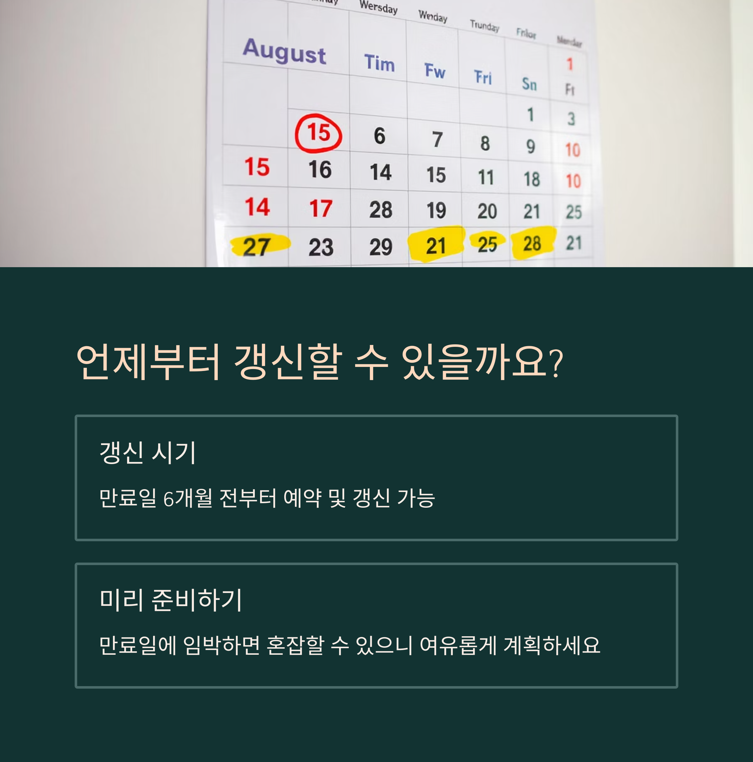 | 갱신 대상자 | 만료일 6개월 전부터 갱신 가능합니다 |