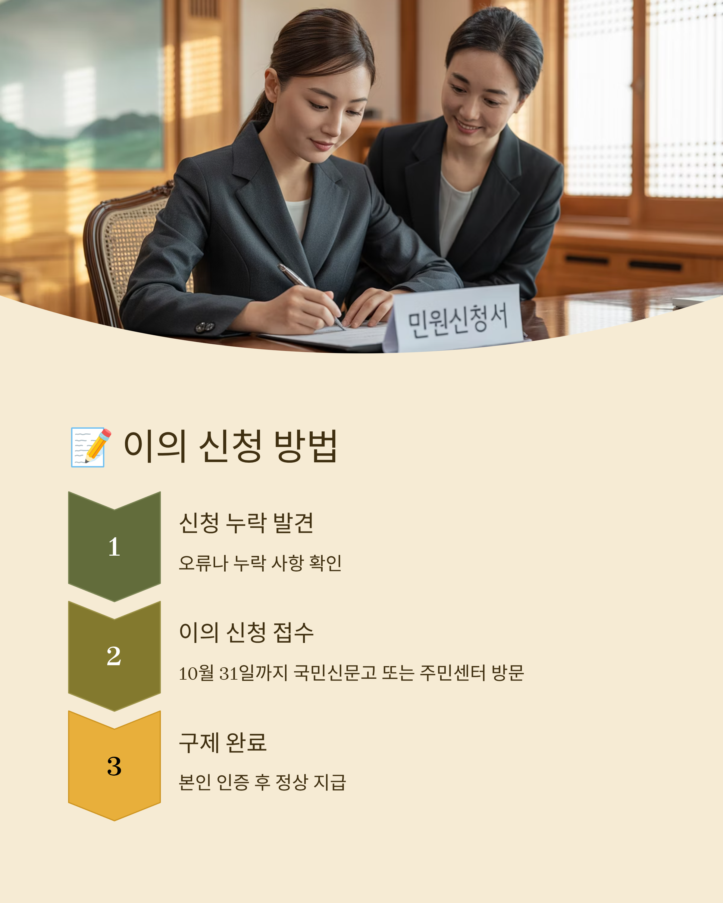 만약 신청이 누락되거나 오류가 발생했을 경우, 이의 신청을 통해 구제받을 수 있습니다. 10월 31일까지 국민신문고나 주민센터를 방문하여 본인 인증 후 접수하면 됩니다. 제 지인 중 한 분도 보험료 합산 기준 오류로 제외되었지만, 이의 신청을 통해 정상적으로 지원금을 받게 되었답니다.
