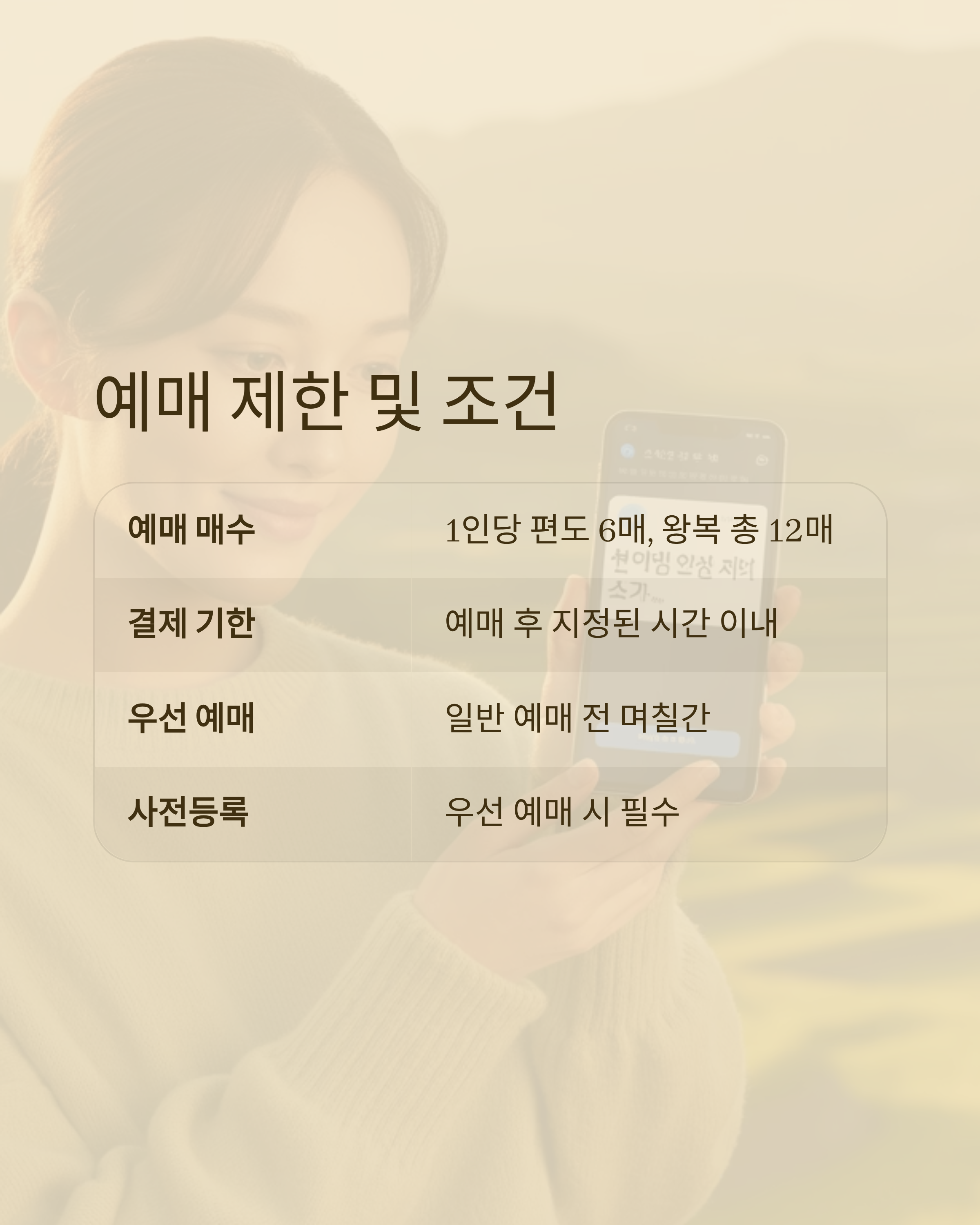 | 예매 매수 제한 | 1회당 최대 일정 매수 | 예: 1인당 편도 6매 / 왕복 총 12매 제한 |