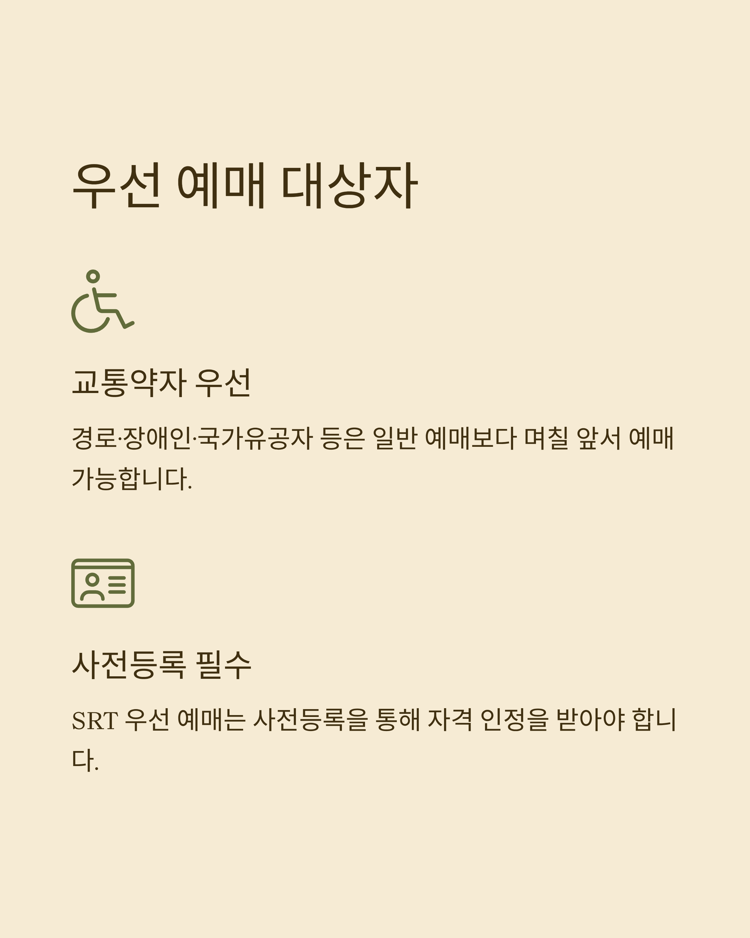 명절 승차권 예매는 경로·장애인·국가유공자 등 교통지원 대상자에게 먼저 예매 기회가 주어지는 경우가 많습니다. 예매 일정 중 ‘우선 예매’ 기간이 따로 있고, 이 기간 동안 해당 대상자는 일반인보다 앞서 예매할 수 있어 경쟁이 덜한 경우가 많습니다.