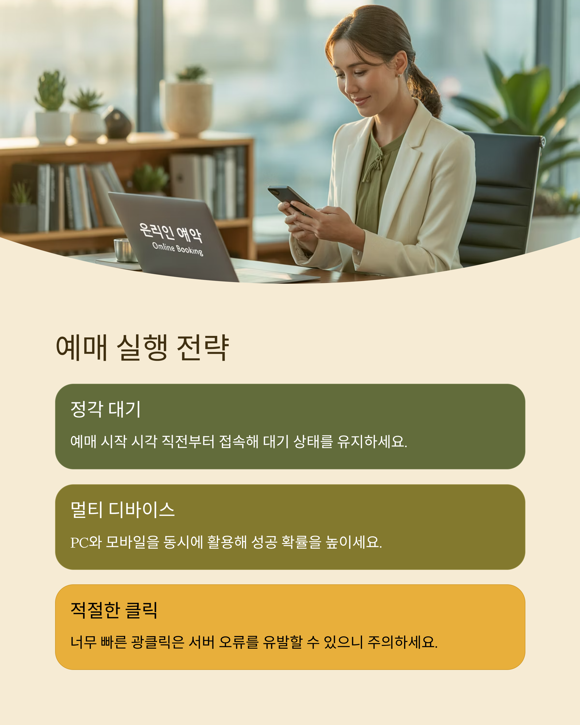 A. 첫째, 예매 시작 시각보다 몇 분 전부터 접속해 대기 화면에 있어야 합니다. 둘째, PC와 스마트폰을 동시에 활용하면 접속 오류나 로딩 지연 시 대안을 마련할 수 있습니다. 셋째, 노선에 따라 KTX보다 SRT 좌석이 남아 있는 경우도 많으니 두 경로를 모두 예매 가능한 상태로 준비하세요. 마지막으로, 주변역이나 경유역 이용도 좋은 전략이 될 수 있습니다.