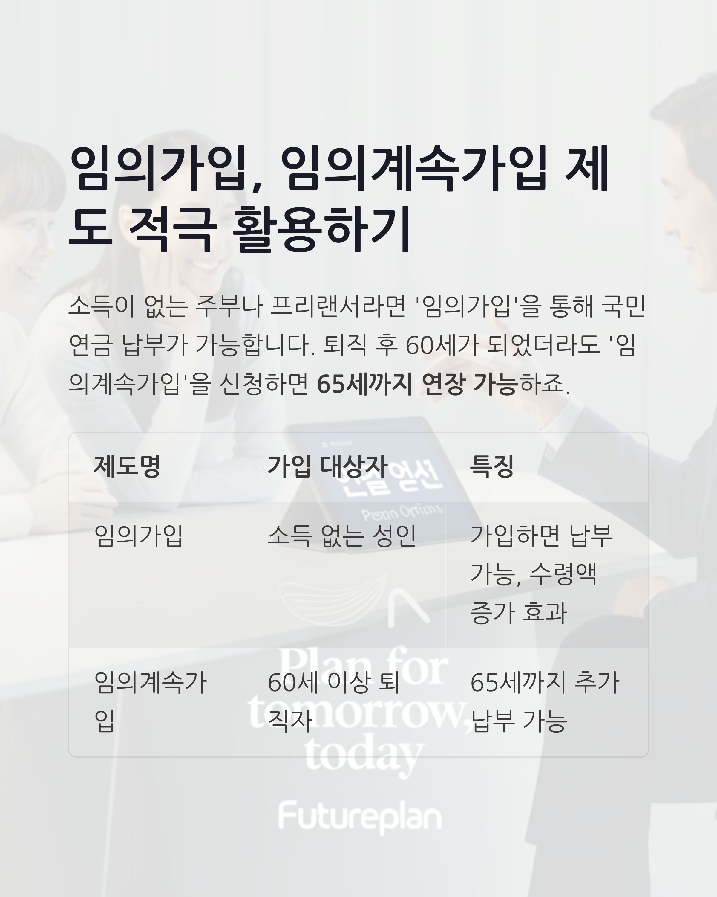 | 임의가입 | 소득 없는 성인 | 가입하면 납부 가능, 수령액 증가 효과 |