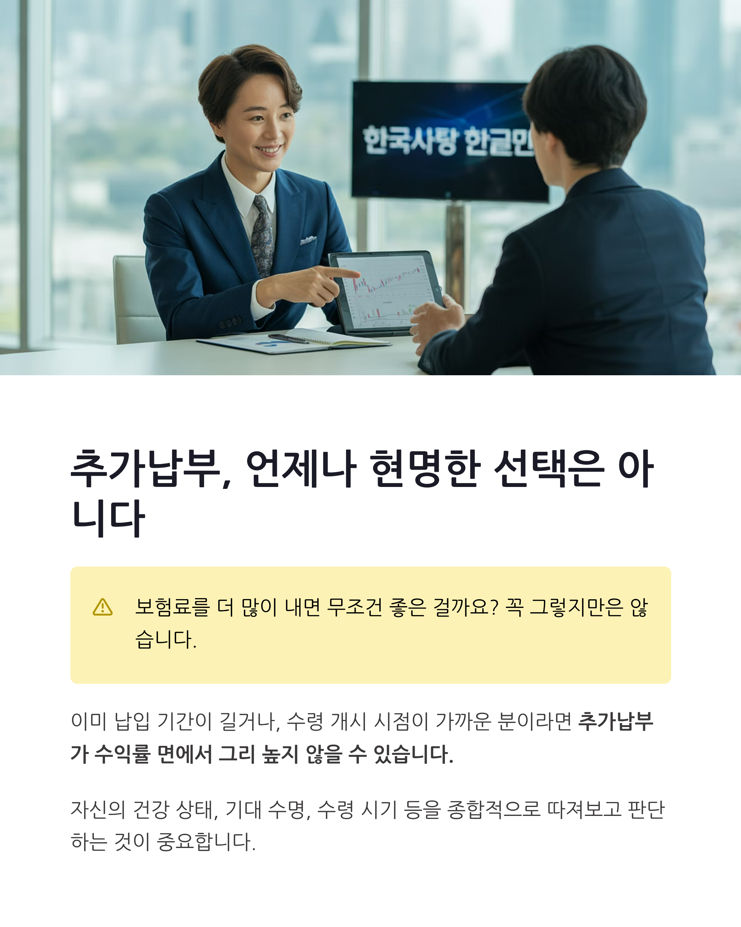 이미 납입 기간이 길거나, 수령 개시 시점이 가까운 분이라면 추가납부가 수익률 면에서 그리 높지 않을 수 있습니다.
