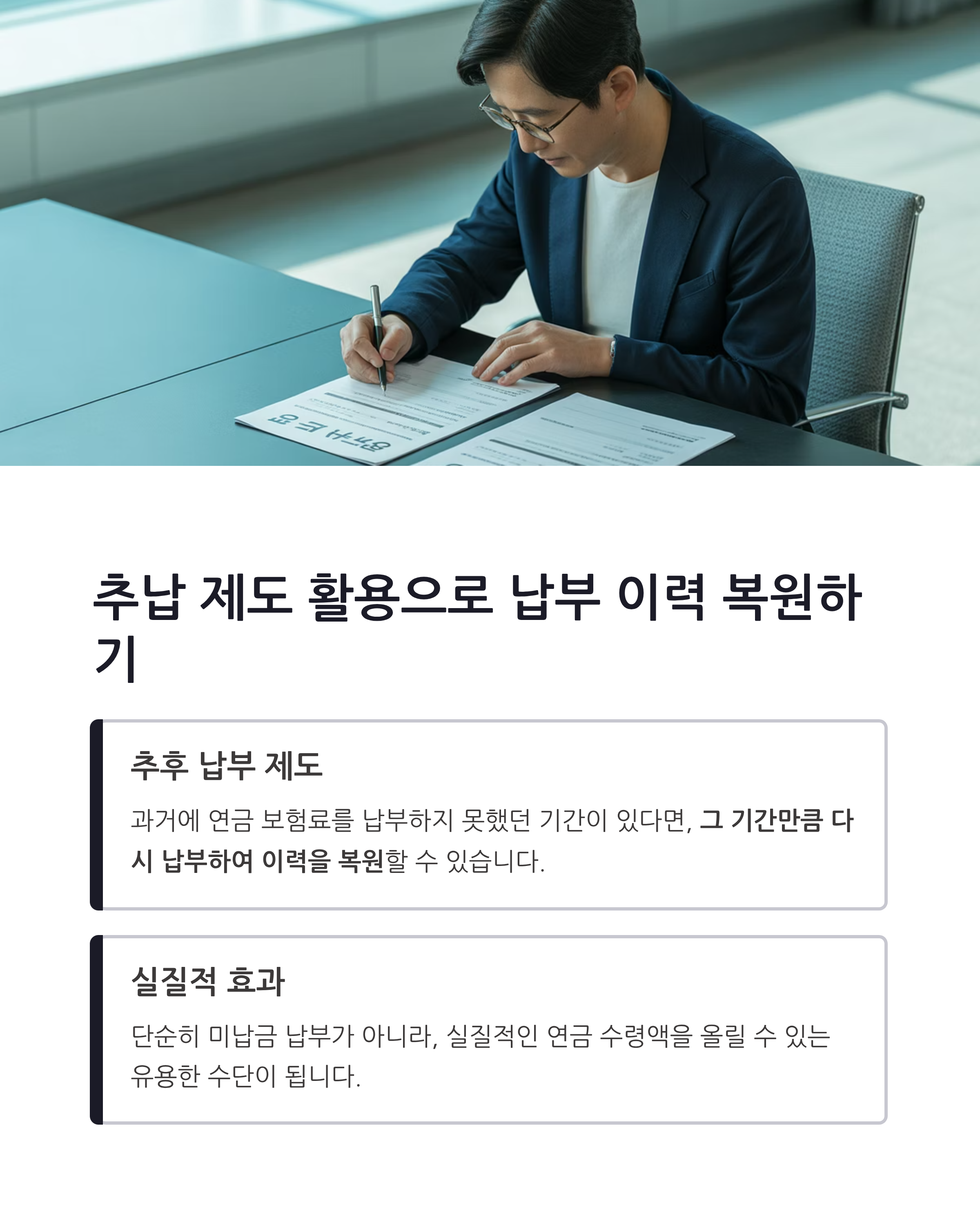 이는 단순히 미납금 납부가 아니라, 실질적인 연금 수령액을 올릴 수 있는 유용한 수단이 됩니다.