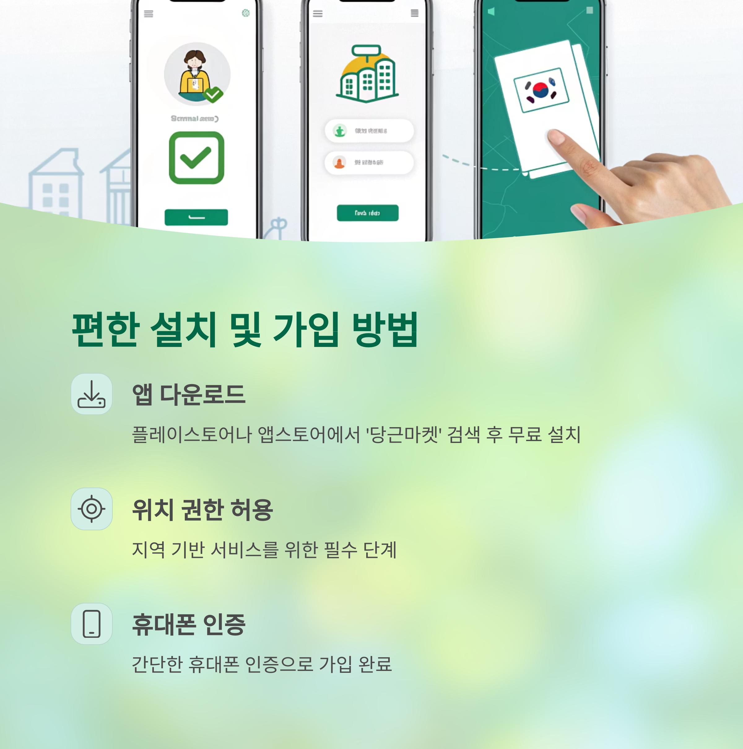 | 안드로이드 기기에서 당근마켓 검색 후 설치 | 아이폰에서 앱스토어로 설치 진행 | 지역 기반 서비스를 위해 필수로 허용 필요 |